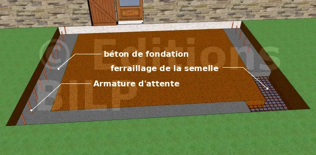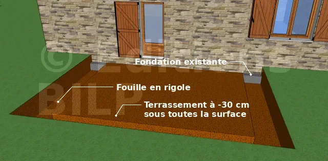 Après avoir décaissé la plateforme à moins 30 voire 40 cm (toute la terre végétale), il faut terrasser en rigole de 45 à 60 cm suivant le poids de la construction et la largeur des murs. Une fois que vous avez trouvé les fondations existantes, dégagez sur toute la largeur de la fouille et creusez au moins sur 30 cm en profondeur, sans descendre plus bas que celles existantes.