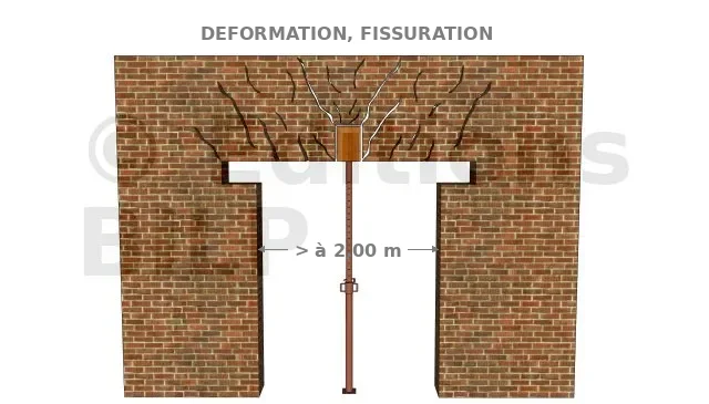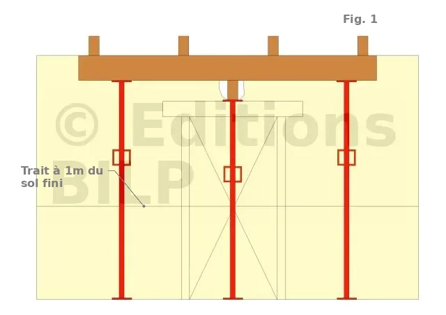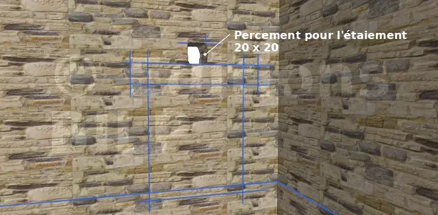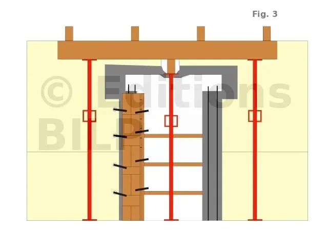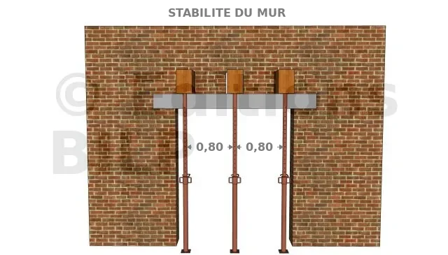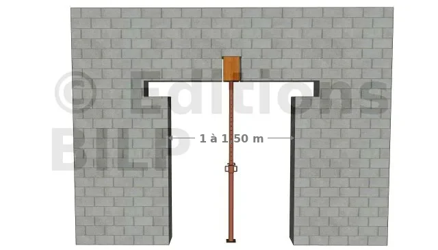 - Pour les murs de façade ou de refend avec plancher inférieur (cave ou sous-sol), l’étaiement partira depuis le sous-sol, sous les étais afin de ne pas détériorer le plancher et soutenir le poids total.
