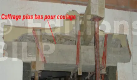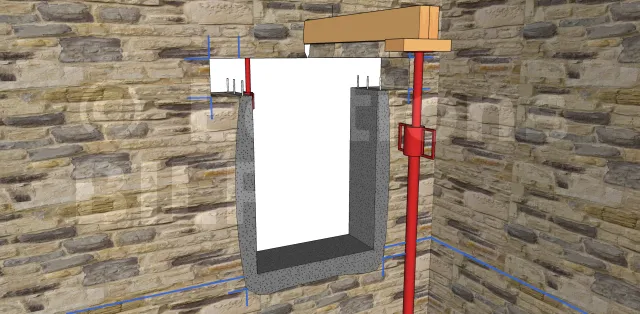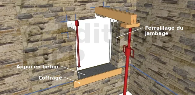 Percez dans la fondation ou dans le sol pour sceller 2 fers à béton de 10, placez 2 barres de diamètre 10 jusqu’à 15 cm dans le linteau. Coffrez les joues extérieures réglées d’aplomb et bien plaquées contre le mur à l’aide de serre-joints et coulez les jambages en prenant soin d’ajuster l’arase du jambage à la bonne hauteur.