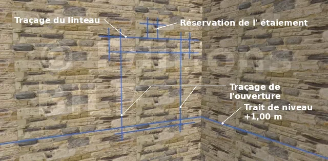 Il se fait en premier pour avoir la partie à démolir. Tracez l’ouverture finie puis rajouter 10 cm mini sur les côtés et 25 à 30 cm pour le linteau. Faire un trou dans le mur sur le dessus du linteau, il servira pour le calage et de repère afin de tracer la partie extérieure à l’aide d’un niveau et d’une équerre.
