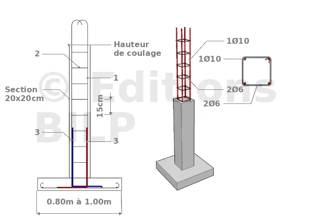 Les poteaux comportent des aciers porteurs dans le sens vertical (1), des cadres (2) placés sur le pourtour qui donnent sa forme au poteau et des étriers ou épingles quand le poteau est rectangulaire. Le poteau sera relié à la fondation ou au plancher par des barres d’attente (3). Le retour d’équerre en partie basse permet d’avoir une longueur d’ancrage suffisante. Le cintrage des barres en partie supérieure évite les blessures par percement en cas de chute.