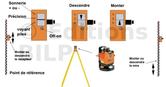 Une fois que le laser est en station, à l’aide d’une mire positionnée sur votre point de référence, faites coulisser le récepteur le long de la mire jusqu’au moment où le récepteur i[...]