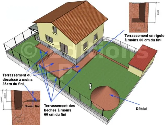 Le terrassement commencera par le déblaiement de toute la surface des allées et de la terrasse. Sur de grandes surfaces et selon la nature du terrain, le terrassement peut vite s’avérer long et fastidieux. Il peut être plus judicieux de louer une mini-pelle dans ce cas là. Autre détail qui peut avoir son importance, prévoyez un espace de stockage des déblais suffisamment grand, en sachant que la terre foisonne (augmentation du volume de 30% environ).