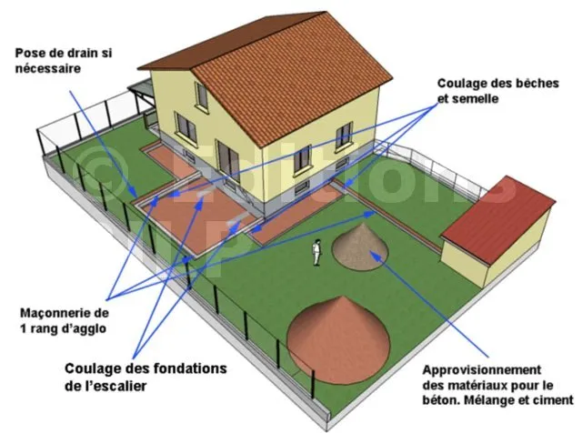 Le coulage de la semelle S35 sous les murets se fera dès que le terrassement sera terminé, afin d’éviter un possible effondrement des parois en cas d’intempéries. Le béton armé utilisé aura un dosage de 350 kg/m3. En plus de cela, des fondations seront également nécessaires pour l’escalier qui mène à l’habitation.