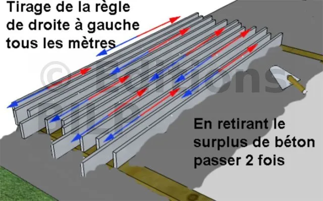 Le béton s’étale à la pelle et au râteau sans en mettre trop. Une fois que vous avez rempli l’espace entre deux guides sur une longueur d’environ 1 mètre, vous tirez votre règle en faisant des mouvements de droite à gauche tout en faisant glisser correctement votre règle sur les guides. Enlevez le surplus de béton à la truelle au fur et à mesure.