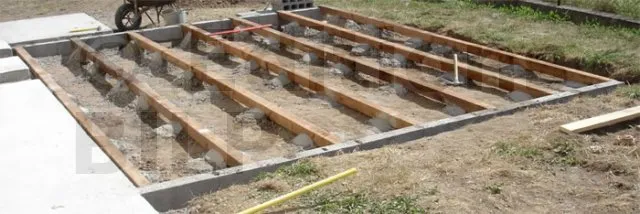 Un trou réalisé à la bêche permet un minimum de béton. Le réglage s’effectuera soit à la règle métallique et un niveau à bulle soit au laser. Ce réglage doit être très soigné car les bois doivent reposer parfaitement sur les plots. Il y a la possibilité de régler les plots 1 à 2 cm plus bas et de faire reposer les bois sur une couche de mortier et de mettre à niveau les bois de 10 x 10. Cette méthode paraît plus judicieuse.