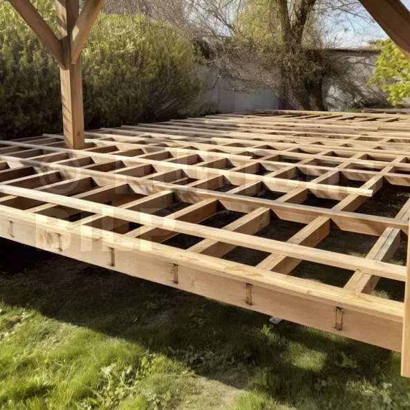 Un film géotextile est fixé sur les bois avant de poser les lambourdes.