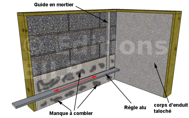 Remplissez entre les guides (CORPS D’ENDUIT), tirez la règle entre les guides en sciant de droite à gauche et vice-versa) toujours en montant.