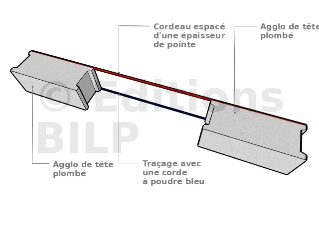 Lors de la pose des agglos intermédiaires, la base de ceux-ci doit correspondre parfaitement au trait bleu d’implantation ou être au-dessus de l’agglo inférieur. Le réglage de la partie haute se fait par rapport au cordeau.