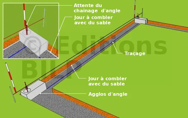 - *Traçage par rapport aux cordeaux d’implantation avec un niveau ou avec un fil à plomb d’axe.