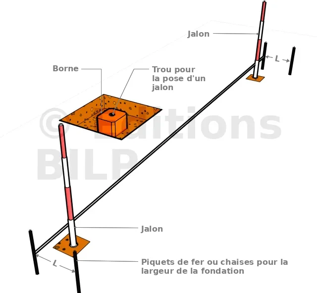 Dans un premier temps, il faut trouver les bornes qui limitent le terrain, puis poser deux jalons à l’intérieur. Ensuite, tendre un cordeau entre les deux jalons. Ce cordeau définira l’alignement à ne pas dépasser, enduit inclus.