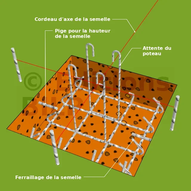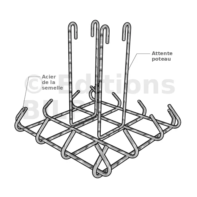 La fondation d’un pilier ou d’un poteau est réalisée en utilisant une semelle isolée qui travaille dans les deux directions. Cette technique permet de tendre la partie inférieure de la fondation dans les deux directions, créant ainsi un quadrillage porteur grâce aux armatures préfabriquées.
