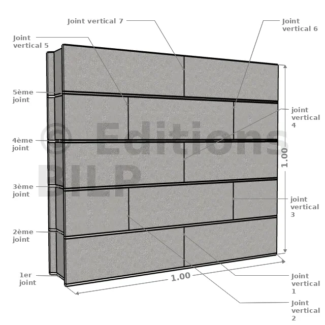 Le décalage des joints verticaux d’une assise sur l’autre doit être compris entre le 1/3 et la 1/2 longueur du bloc. Ce décalage est de préférence d’une 1/2 longueur.