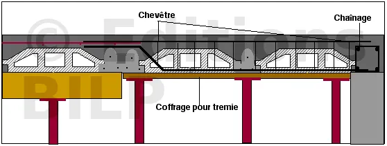 La trémie d’escalier est une ouverture prévue dans le plancher ou une dalle béton, pour permettre le passage de l’escalier ou cage d’ascenseur). Elle est renforcée par les chevêtres (poutre noyée) dans un sens, et le renforcement de la dalle par le doublage des poutrelles dans l’autre sens . Voir aussi chevêtre