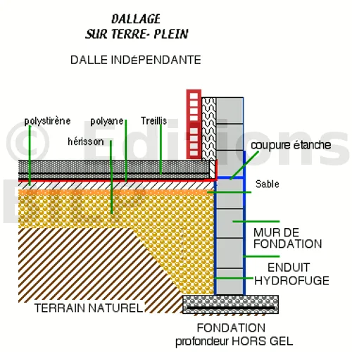 Le dallage désolidarisé se trouve au sol et comprend toutes les couches de matériaux utilisés c’est un plancher auto porté.