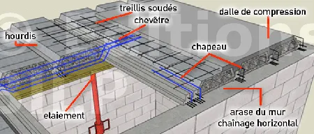 Le ferraillage comprend les chaînages sur les murs avec liaisons (voir le chapitre ferraillage) un treillis soudé anti fissuration sur toute la surface, les renforts (chapeaux sur toutes les poutrelles), les armatures en attente pour la continuité verticale du bâtiment. (Poteaux, chaînages verticaux, escalier, chevêtre et les aciers de renfort autour des réservations.)