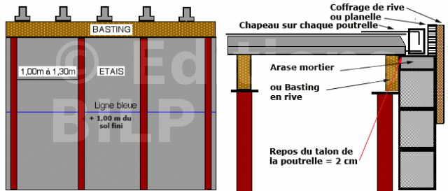 Préparation : avant de poser les poutrelles, il est préférable de faire une petite arase afin de mettre le dessous du plancher de niveau et à la bonne hauteur. Sinon aligner une file de bastings de champ où reposeront les poutrelles.