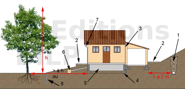 8. Attention aux arbres, on considère en particulier que l’influence d’un arbre s’étend jusqu’à une distance égale à au moins sa hauteur à maturité. S’il est impossible de s’éloigner d’un arbre il est préconisé de créer un écran anti racine.