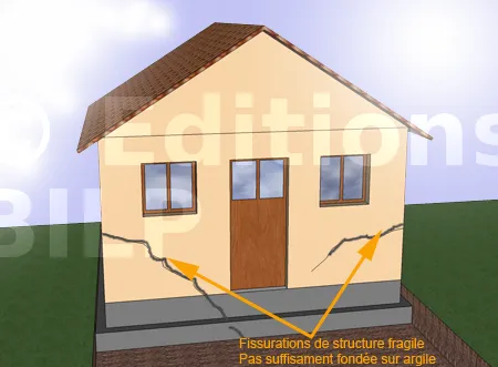 Une maison individuelle, à simple rez-de-chaussée et avec dallage sur terre plein, sur semelles continues, peu ou non armées, pas assez profondes (moins de 80 cm et reposant sur un sol argileux, avec une structure en maçonnerie, sans chaînage.