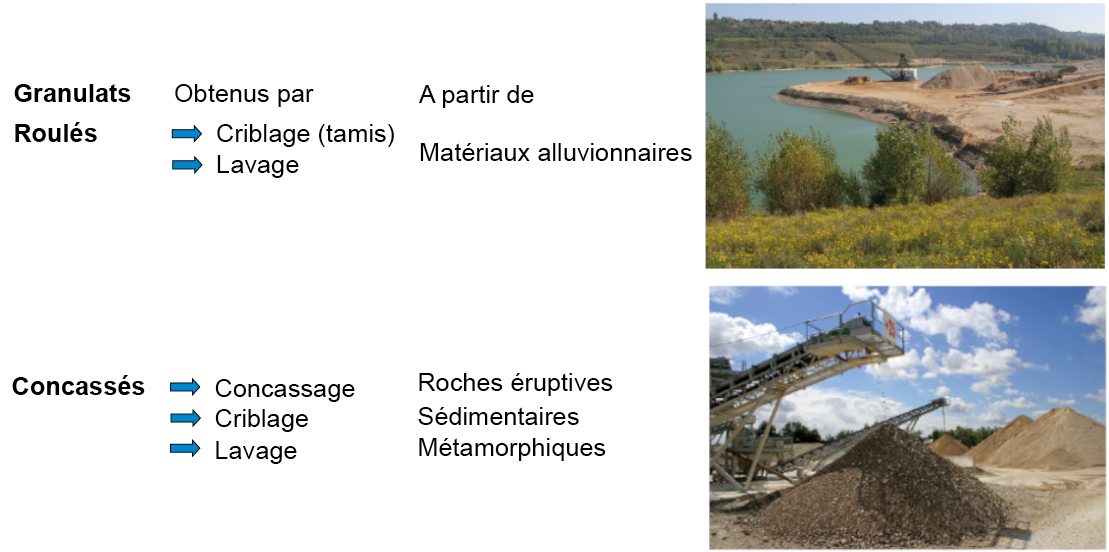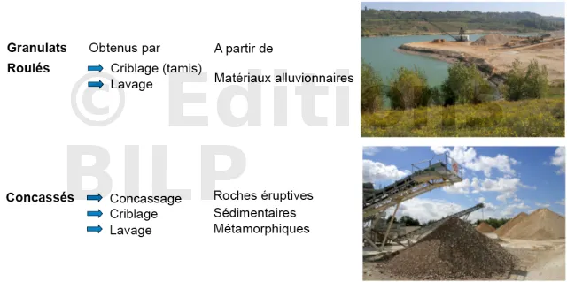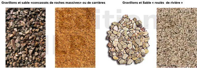 Les granulats les plus couramment utilisés dans la fabrication du béton vont des granulats 0/4 aux granulats 5/20, pouvant être issus d’un concassage ou être d’origine alluvionnaire.