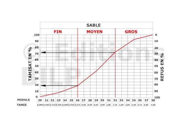 - La plus ou moins grande proportion d’éléments fins ; par exemple, la courbe située au-dessus de celle du sable normal correspond à un sable à majorité de grains fins et c’est l’inverse pour celle située en dessous. En effet, ces trois sables sont des sables 0,15 mm, mais les proportions de grains fins (0,5 mm) sont pour chacun d’eux : 25 %, 45 % et 60 %.