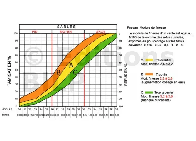 Le module de finesse s’applique plus particulièrement aux sables, car il en est une caractéristique importante. Par exemple, le sable dont la courbe est tracée sur la figure a un module de finesse Mf = 2,66, calculé ainsi.