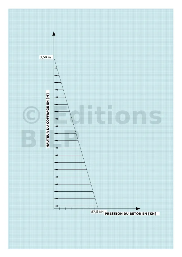 La poussée hydrostatique : le béton pousse le coffrage à l’horizontale. L’intensité de cette poussée est égale à la pression exercée par la masse du béton, soit 25 kN/m². La poussée hydrostatique est directement proportionnelle à la hauteur (h) du béton à couler. Au sommet du coffrage, elle est nulle. Puis elle croit proportionnellement à la profondeur du coffrage pour atteindre sa valeur maximale à 3,50 m au fond de coffrage avec une valeur de 3,50 m x 25 kN/m² = 87,5 kN/m.