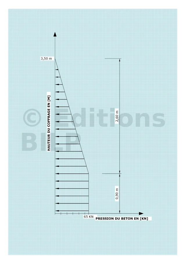 Jusqu’à 2,60 m, cette pression prend la forme d’un triangle (la poussée est triangulaire). Au-delà de 2,60 m, la pression devient rectangulaire (pression uniformément répartie). La poussée du béton agit comme un liquide, mais elle est limitée par la plasticité du béton (cohésion des grains entre eux). En effet, si l’on décoffre immédiatement, on constate que le béton ne s’étale pas complètement, mais s’affaisse uniquement en suivant sa plasticité (cône d’Abraham). Cela signifie que plus le béton est plastique, plus la pression augmente.