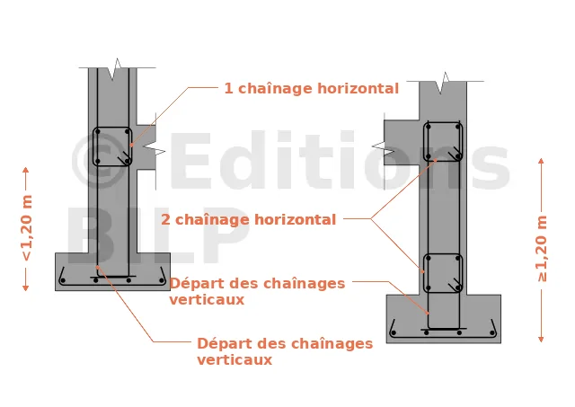 Un chaînage doit être prévu au niveau des fondations. Ce chaînage doit comporter au moins deux lits de deux armatures longitudinales en acier à haute adhérence de nuance Fe E 500, avec un diamètre de 8 mm en zone la, 10 mm en zone l et 12 mm en zone II.