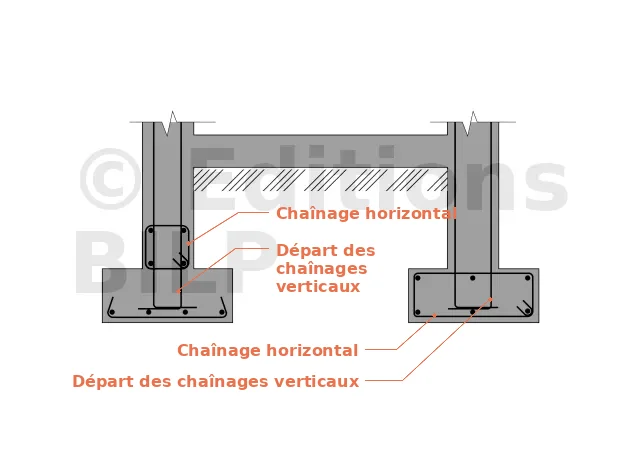 Les armatures des chaînages verticaux ou des poteaux en béton armé doivent être descendues jusqu’en partie basse des fondations.