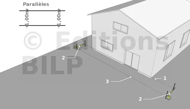 - Tendez un cordeau entre les 2 piquets nouvellement implantés, créant ainsi une ligne parallèle à la façade.