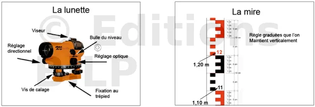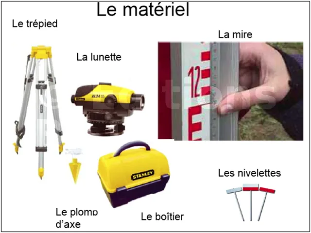 Le nivellement se réalise par visées horizontales. Avec comme matériel un trépied télescopique, une lunette de chantier et une mire. Dans certains cas, comme le report des points, nous pourrons également utiliser le laser.