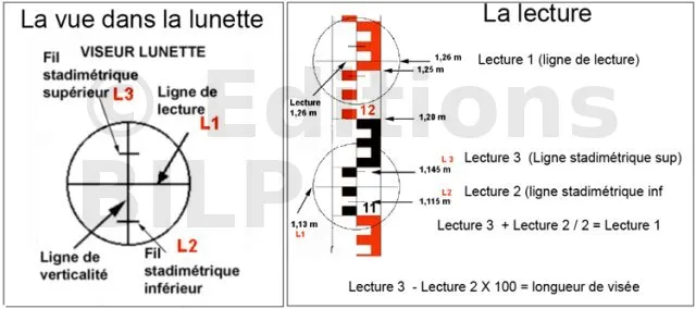L’opération consiste à mesurer la différence de hauteur entre deux points ou à reporter la même hauteur sur un point différent. La mire (règle graduée) est positionnée verticalement et tenue par un porte-mire sur les différents points. L’opérateur, dans la lunette de niveau, lit une hauteur sur le premier point. Ensuite, cette opération est renouvelée pour trouver les différences de niveau en calculant les différences entre les lectures.