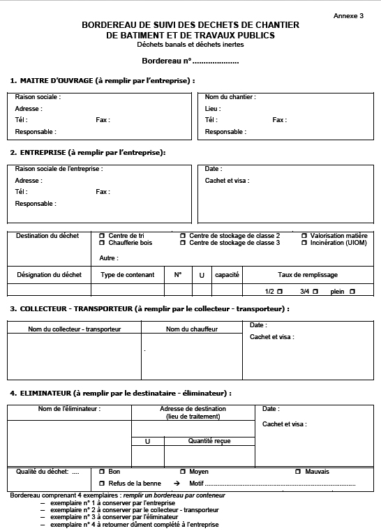 - De prévoir le suivi, par le maître d’œuvre, de l’élimination des déchets produits par le chantier ; suivi des prescriptions générales sur le tri si celui-ci est possible, des dispositions prévues pour l’organisation du chantier et des bordereaux d’élimination des déchets comme pour la démolition.