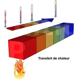 La chaleur se propage en traversant la paroi de la face la plus chaude vers la face la plus froide. C’est par la conduction que la chaleur traverse les parois de notre habitation. Nous verrons plus tard que le rôle d’un isolant est de freiner ce transfert. On parlera de la résistance thermique du matériau.
