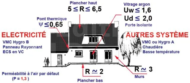 - Caractéristiques thermiques minimales : les garde-fous pour les composants de l’enveloppe (parois, menuiseries, ponts thermiques…) et pour les systèmes (ventilation, chauffage, ECS…)