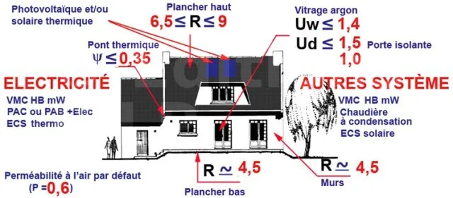 HPE 2005 consommation – 10% ; THPE EnR 2005 consommation -30% + énergie renouvelable ; et BBC Bâtiment basse consommation. Consommation de 50kWh EP/m2an en résidentiel ou -50% en non résidentiel.