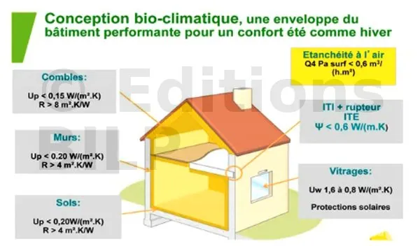 Conséquence majeure de la RT 2012 : une enveloppe performante en été comme en hiver pour atteindre l’objectif de basse consommation énergétique, une conception bioclimatique du bâtiment est nécessaire afin de créer une enveloppe performante tant en hiver qu’en été. Le choix du système constructif revêt une importance capitale et y associer des solutions d’isolation complètes et adaptées devra permettre d’assurer le confort thermique été comme hiver, une excellente étanchéité à l’air et un traitement efficace des ponts thermiques.