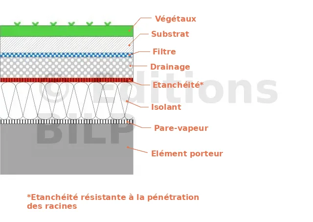 Il s’agit d’un système d’étanchéité recouvert d’un élément drainant, d’un substrat et d’un couvert végétal. La végétalisation des terrasses et toitures peut se faire de trois manières différentes, selon le contexte et l’usage du site. La végétalisation extensive utilise un complexe de culture de faible épaisseur (moins de 10 cm) qui crée un couvert végétal permanent qui ne nécessite que peu d’entretien. Cette technique génère le plus souvent un écosystème sur des surfaces généralement inaccessibles. Ce type d’aménagement est adapté à un grand nombre de surfaces existantes, en raison de sa légèreté, contrairement au système de toiture-terrasse jardin.
