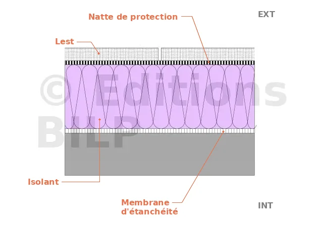 La toiture inversée désigne la toiture plate dont l’étanchéité est placée sur le support et dont l’isolant est posé sur l’étanchéité. L’isolant est donc mouillé par les eaux pluviales. L’isolant est ensuite lesté avec une protection rapportée. Les panneaux rigides en mousse de polystyrène extrudé (XPS) sont les seuls types de panneaux qui conviennent pour ce procédé, selon l’avis technique.