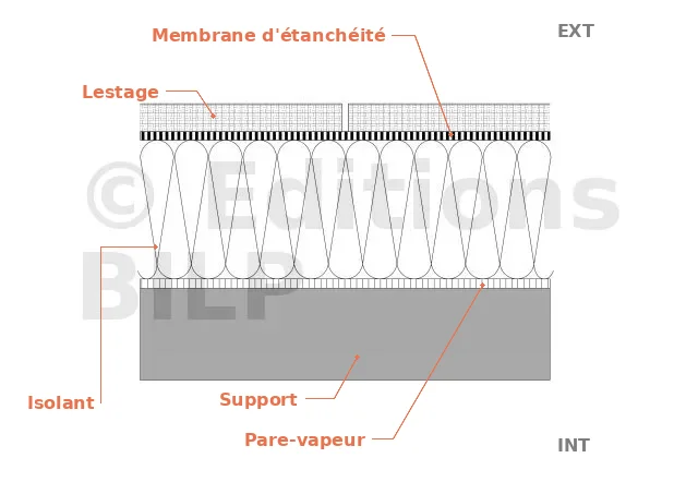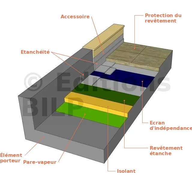 - Élément porteur : partie supérieure résistante du gros œuvre (maçonnerie, béton cellulaire autoclave armé, tôle d’acier nervurée, bois et dérivés…).