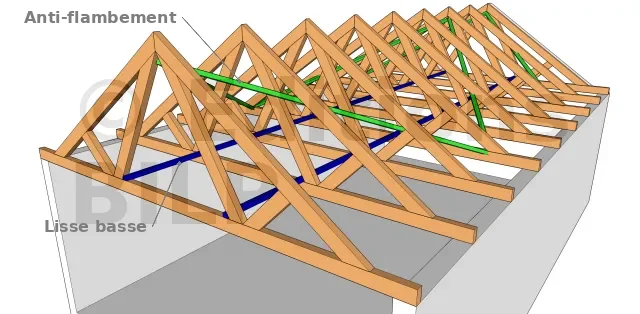 Les barres anti-flambement s’opposent aux déformations dues aux charges permanentes et aux variations climatiques. Elles sont constituées de pièces de bois clouées sous les arbalétriers à un angle d’environ 45°, et sont placées du faîtage vers les appuis. Toutes les pièces d’un même versant doivent être traversées par une barre anti-flambement.
