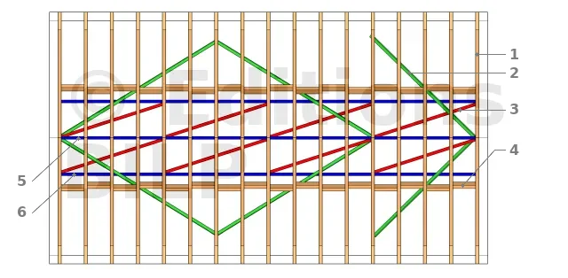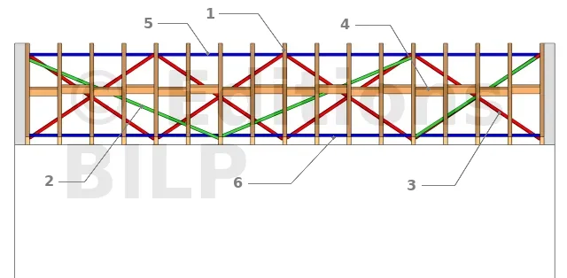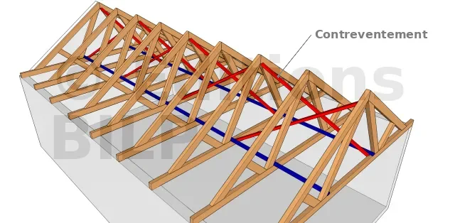 Les barres de contreventement s’opposent au déversement. Elles maintiennent les fermettes avec le bon écartement et l’aplomb (inférieur à 5mm/m). On trouve les lisses filantes qui relient les arbalétriers ainsi que les entrait, mais aussi les diagonales de contreventement qui assurent la triangulation.