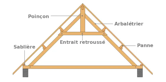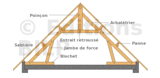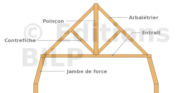 Attention : La réaction en pied de la jambe de force est variable selon l’inclinaison. Elle peut entraîner des poussées horizontales. Le maintien des pieds d’arbalétriers doit alors être assuré par un tirant en acier placé au niveau du plancher.
