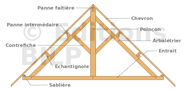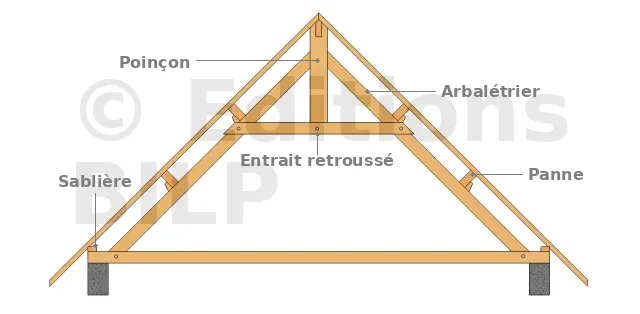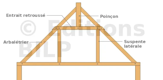Une première solution consiste à utiliser des contre-fiches qui reçoivent en outre la réaction d’appui des arbalétriers. Cette solution nécessite de fortes sections et les différentes pièces sont placées dans un même plan. Les portées courantes ne dépassent pas 8 m. Une autre solution consiste à utiliser une ferme triangulée et des poteaux moisés. La stabilité est assurée dans le plan des entraits par un contreventement qui reporte les efforts au droit des pignons. La portée peut alors atteindre 12 m.