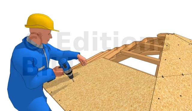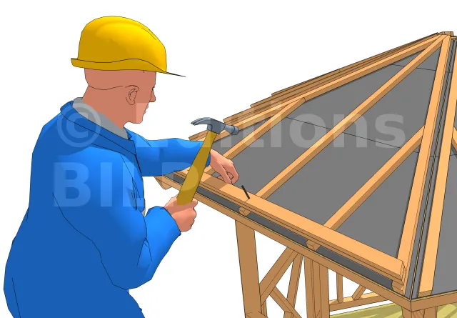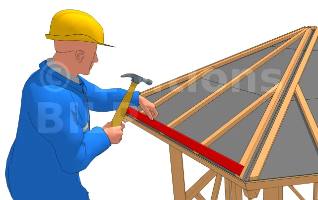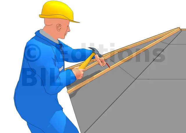 La première rangée de liteau sera posée au niveau de la ligne de gouttière. Prendre le liteau à fixer, présentez-le sur la partie la plus basse de la toiture le long de la gouttière. Clouer au niveau de la première extrémité des chevrons de charpente.