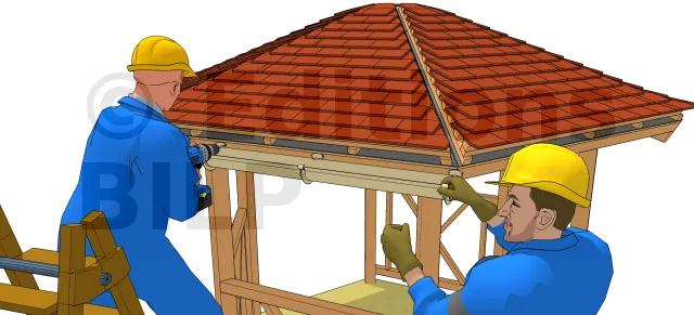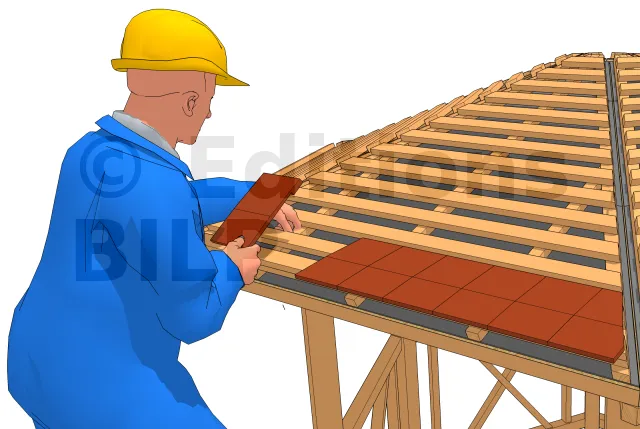 Superposer les nouvelles rangées à celles qui sont déjà en place. Les tuiles seront fixées sur les liteaux par des ergots ou tenons. La pose de chaque rangée se fait à joints croisés, chacune des rangées sera donc décalée d’une tuile.