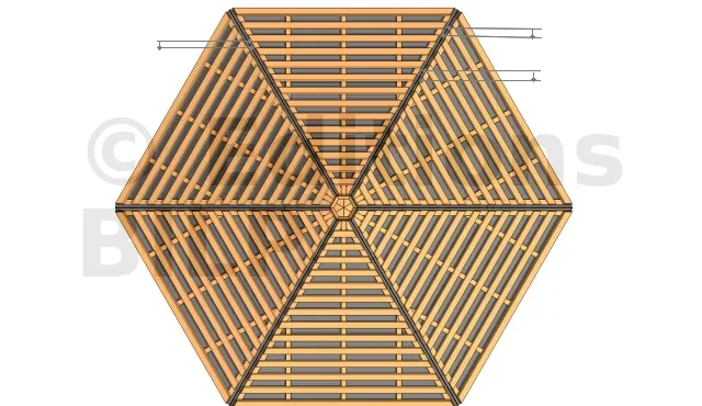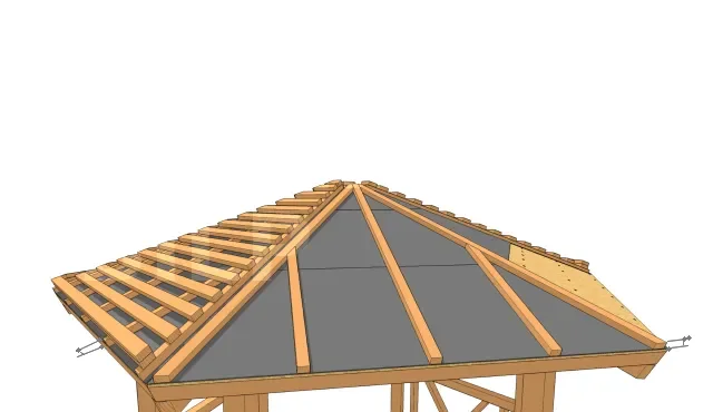 Les autres liteaux seront fixés parallèlement à la première rangée (avec une distance correspondante au pureau). Poser des gabarits entre chaque liteau pour éviter des erreurs et pour accélérer le travail. Assurez-vous de bien clouer sur toutes les intersections des liteaux aux chevrons. Répéter cette action jusqu’au sommet de la toiture (au faîtage). Puis couper à l’aide d’une scie les bouts de liteaux qui dépassent du bord, c’est-à-dire au niveau des rives latérales.