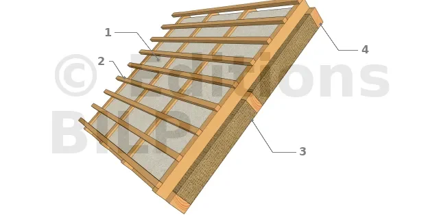 Il est impératif que l’isolant soit composé de deux couches : une couche avec un pare-vapeur côté habitation et une couche sans pare-vapeur. Un intervalle d’au moins 2 cm doit être maintenu entre la face inférieure des liteaux et l’isolant. Cette réserve permettra à l’air de circuler et d’éviter la condensation.